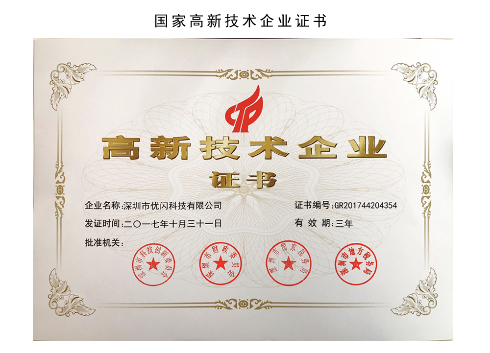 2017年,優閃通過國家高新企業,獲得高新技術企業稱號,在科研方面獲得扶持,優閃也認識到不僅僅是做企業還肩負社會責任,永懷感恩之心,做良心產品,不為謀取利益,只為奉獻光明!我們將繼續秉承“以科技求發展、以誠信為紐帶、以質量為本、以服務為基礎、以市場為導向”的發展理念,為廣大客戶提供“優質的產品、完善的服務”。心見、遠見、共建未來!真誠希望能與您攜手共進、合作雙贏!