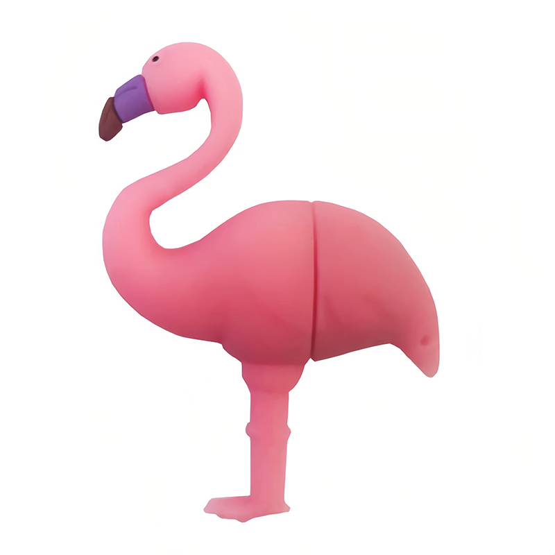 這款 U 盤以愛心火烈鳥為外形設計:整體采用柔粉色pvc軟膠材質,還原了火烈鳥圓潤蓬松的體態,兩只火烈鳥的脖頸自然彎曲交疊,恰好形成浪漫的心形輪廓;細節處點綴了淡紫色喙與黑色小眼睛,讓造型更生動可愛。U 盤采用分體式結構 —— 其中一只火烈鳥的身體是 U 盤主體(內置 USB 接口),另一只則是配套保護蓋,使用時拔出主體即可。