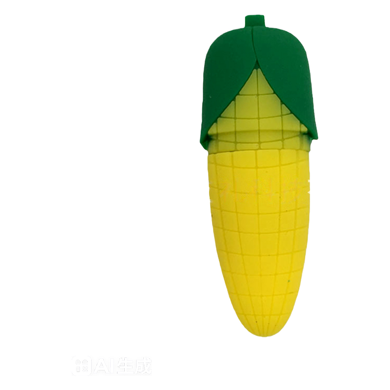 這款玉米U盤以仿真新鮮玉米為核心外形設計:主體采用鮮黃色pvc軟膠材質,復刻了玉米粒的網格紋理,翠綠的玉米葉外殼,視覺上高度還原真實玉米的飽滿質感;外殼與 U 盤主體為分體式結構,使用時拔出帶 USB 接口的芯片即可,閑置時套回外殼,既能保護接口,又能恢復完整的玉米形態。