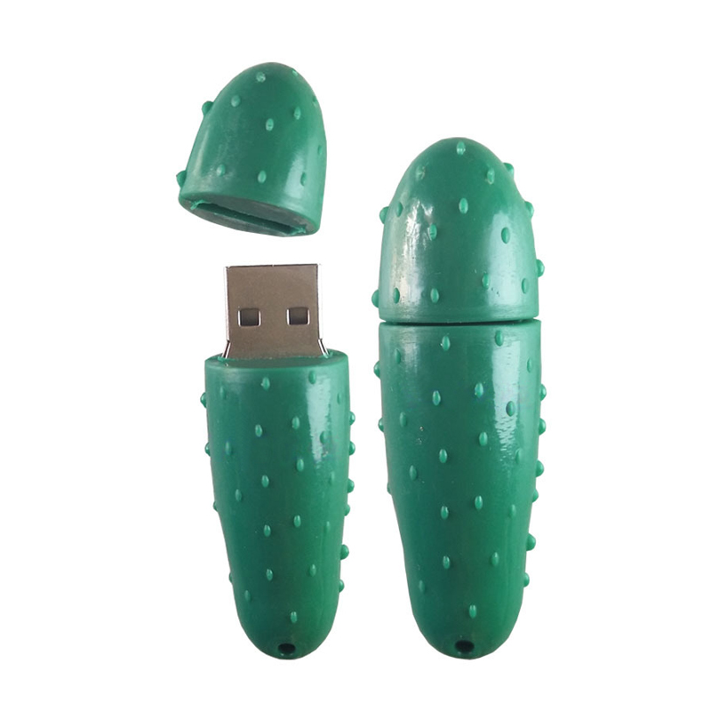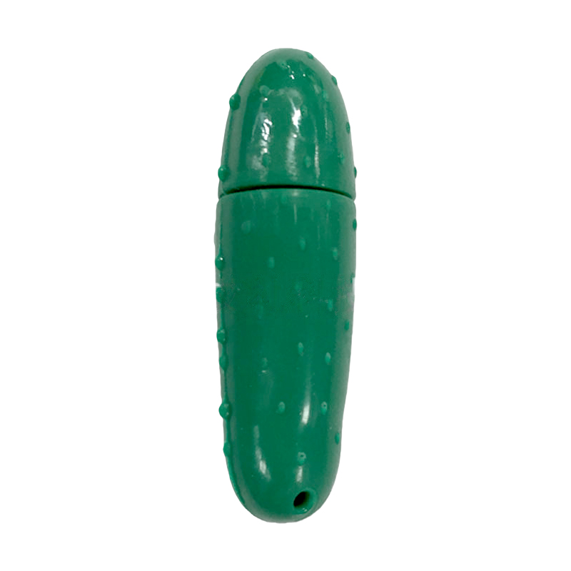 這款 U 盤以迷你仿真小黃瓜為核心外形設計:整體采用清新翠綠色的柔潤pvc軟膠材質,表面復刻了黃瓜標志性的細密立體小凸起(還原真實黃瓜 “刺” 的質感),從形態到細節都高度貼近鮮嫩小黃瓜的模樣;采用分體式結構 —— 上半截小黃瓜是接口保護蓋,下半截內置 USB 接口,使用時拔出接口即可,閑置時蓋回就能恢復完整的黃瓜形態,底部還帶有掛孔,可穿繩隨身掛帶。