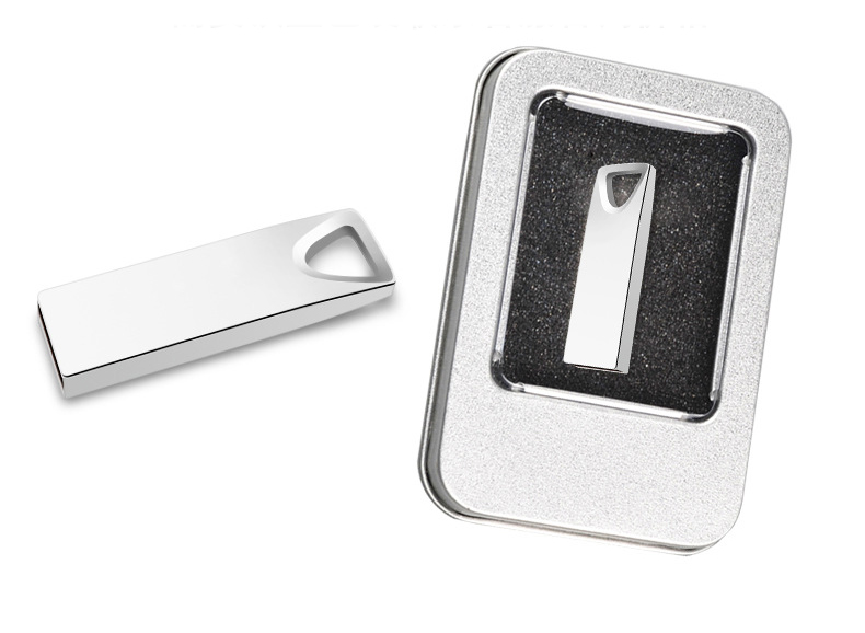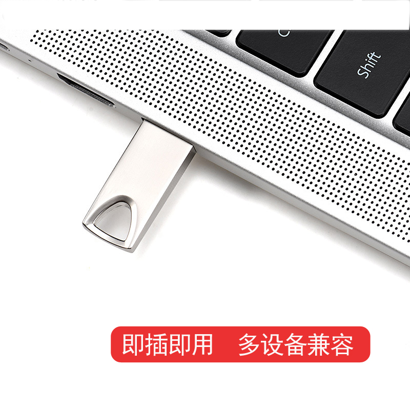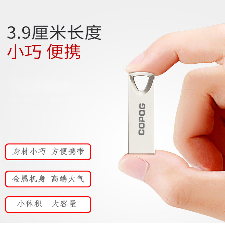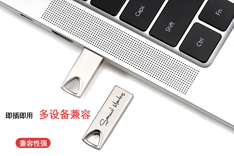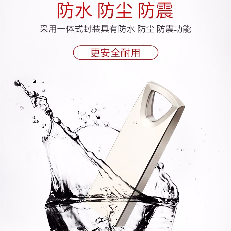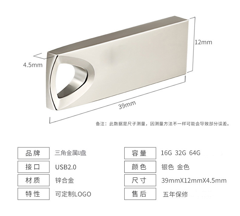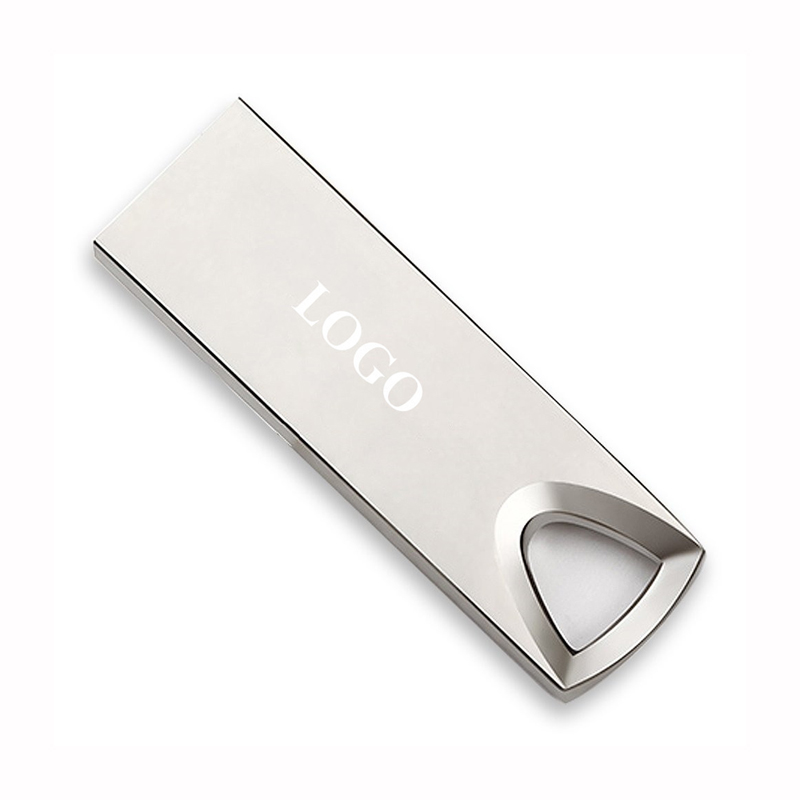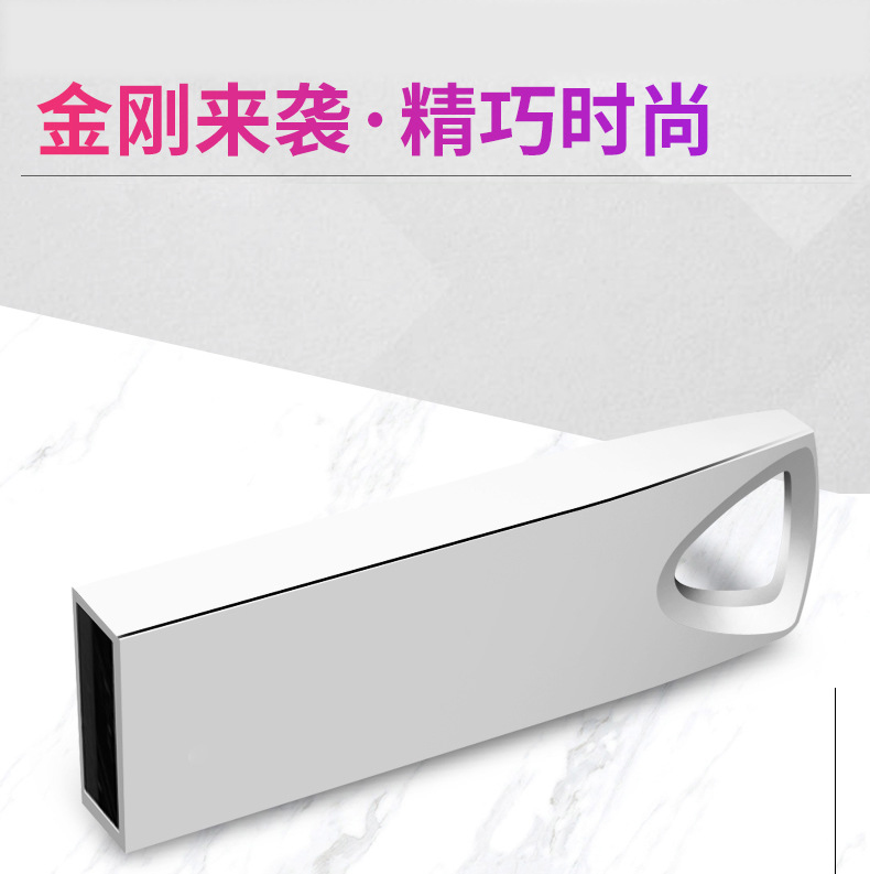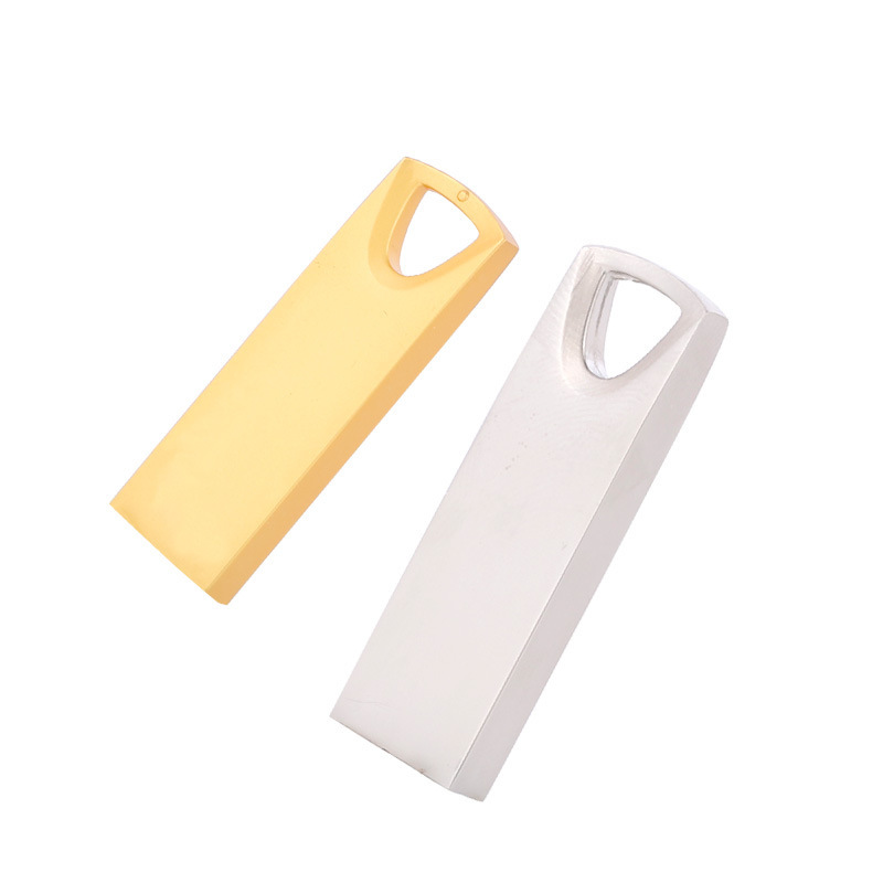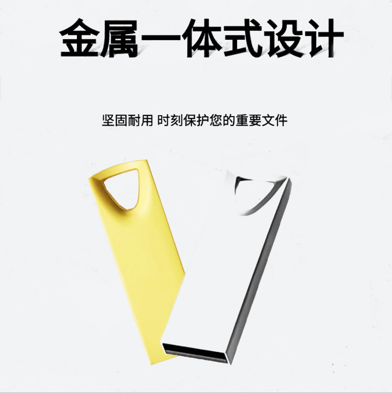 圓潤三角孔形狀的金屬鑰匙扣U盤采用一體設計,插入U盤就能直接使用,非常方便,有金色和銀色兩個款,正面可以激光雕刻logo,配合鑰匙扣掛在包包上使用非常方便。